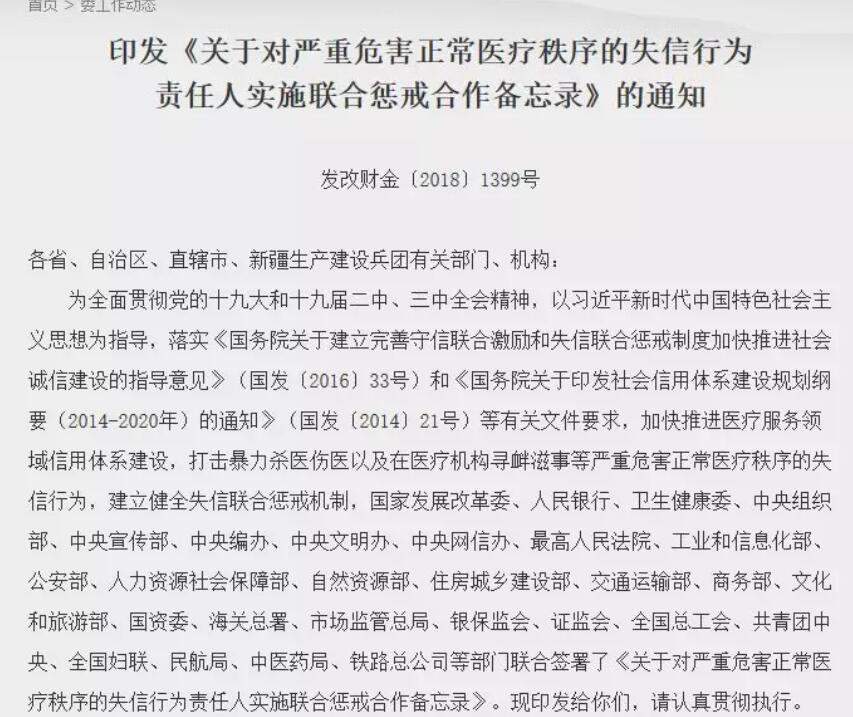 近期,中央相關部門聯合發佈了**《關於對嚴重危害正常醫療秩序的失信行為責任人實施聯合懲戒合作備忘錄》!**