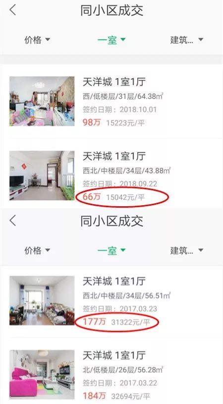 **部分樓盤價格“腰斬”。**以燕郊天洋城為例,同樣是一室一廳西北朝向的房子,2017年3月鏈家成交價曾達到3.1萬/平米,今年9月成交價只有1.5萬/平米,跌幅達到50%。