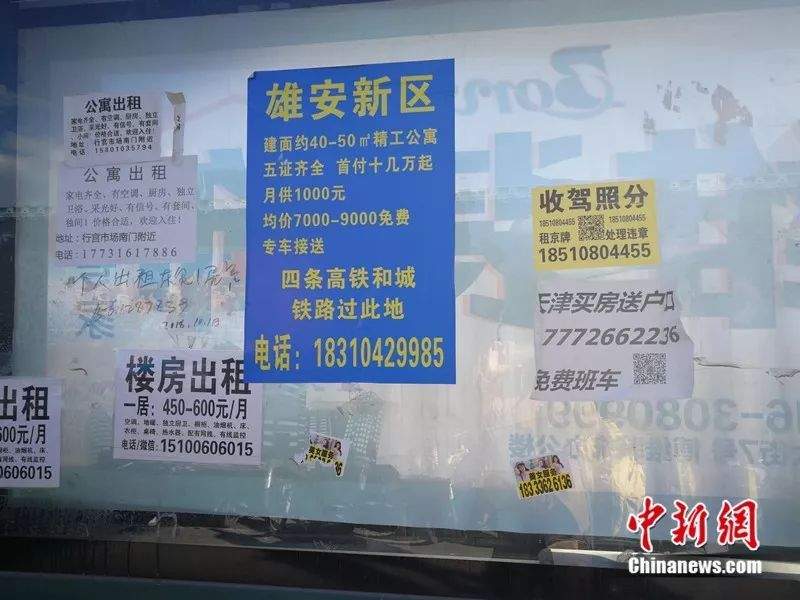 街道公交站牌旁邊的綜合宣傳欄裏貼着雄安新區的廣告,“五證齊全,首付十幾萬起,均價7000-9000,免費專車接送”。