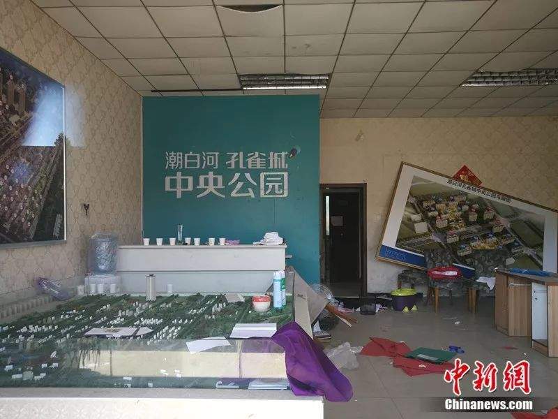不少售樓處大門緊鎖,甚至拉下了防盜鐵門,只剩下門店招牌。從一家已經關門的售樓處門外望進去,潮白河孔雀城中央公園鳥瞰圖的橫幅一邊掉了下來,斜掛在牆上,地上散落着廢紙、條幅和揉成團的營業執照複印件,沙盤上放着落灰的殺蟲劑。只有櫃枱上齊刷刷擺放的七個一次紙杯,能讓人聯想起當年店裏招待購房者的盛況。