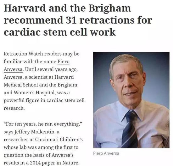 10月15日,哈佛要求撤稿前哈佛醫學院教授、再生醫學研究中心主任皮耶羅·艾佛薩(Piero Anversa)博士高達31篇關於心臟幹細胞的研究論文,這些論文涉嫌偽造和篡改實驗數據。