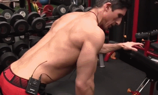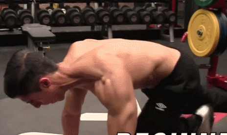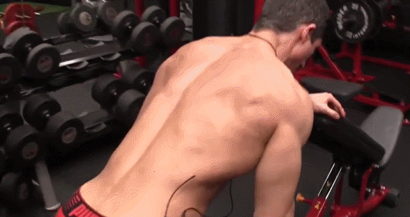 啞鈴划船要注意:首先抬肘關節時要抬到身體上面去,其次胳膊要儘量往脊柱靠攏: