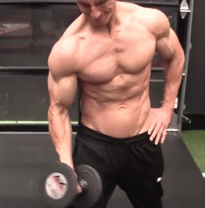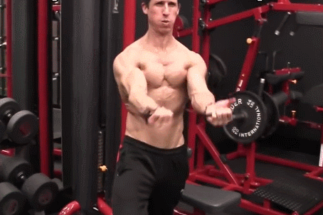 以及肩前舉,這個動作看好是斜舉,也就是按照肌肉纖維的方向舉啞鈴,實際上之前所有的各種斜向動作的目的都在於讓動作本身能夠沿着肌肉纖維的方向進行,這樣可以取得最好的效果: