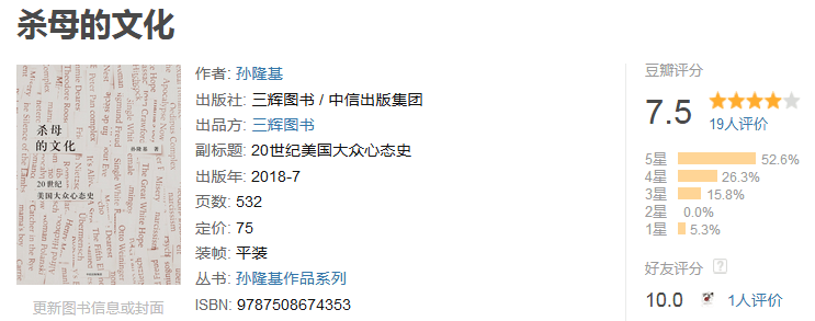 《殺母的文化》這本書,是孫隆基2009年出版的一本專論美國大眾文化的讀物,這本書最大的特點,就是給人一種文青的感覺,如果説《新世界史》裏,孫隆基忍不住欲對歷史的起承轉合,採取一種抒情筆墨與文學修辭來進行表達的話,那麼,在《殺母的文化》裏,我們看到了孫隆基繼續從文學藝術這個緯度來擷取美國大眾心態的素材,以此作為他立論的原始材料。