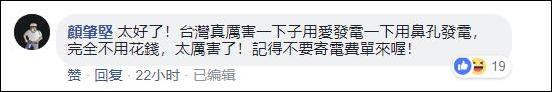 他們留言説,“台灣真先進,不但能用愛發電,還能插鼻孔發電”,“太好了!台灣真厲害,一下子用愛發電,一下子用鼻孔發電,完全不用花錢”。