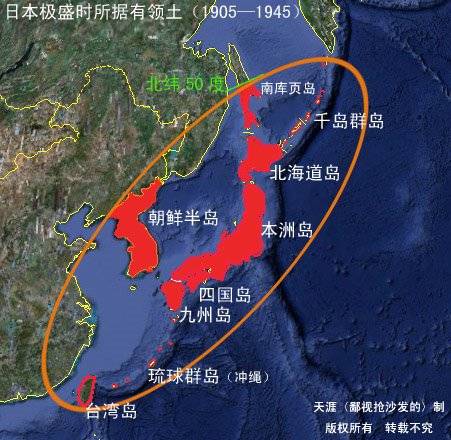 由此而引發的一系列戰爭,使得東亞外島地區(還加上了起到 了“陸島橋樑”作用的朝鮮半島)至 1905 年基本併入了日本國土。