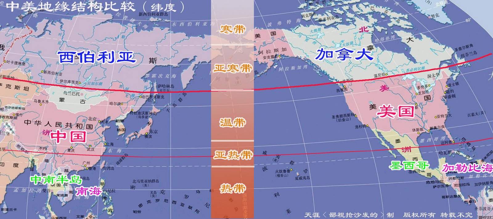 這只是一個大概的對比,我不可能把每個細節都拿出來做比較。中、美、歐是最適合人類生存的 地區(大面積)是不爭的事實了。 =============================================================樓主,中國一定要東出太平洋麼,從地緣上看中國的利益在南海,在印度洋直到中東啊,出太平 洋只基於一個於美國爭霸的理由,值得麼。