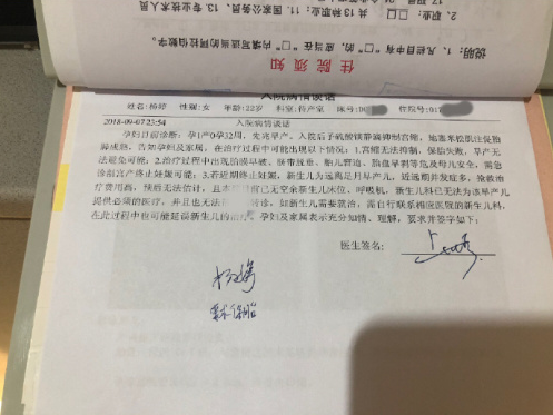 開具於事發當日23:54的入院病情談話顯示亦為先兆早產,治療方式為硫酸鎂靜滴抑制宮縮,地塞米松肌注促胎肺成熟。