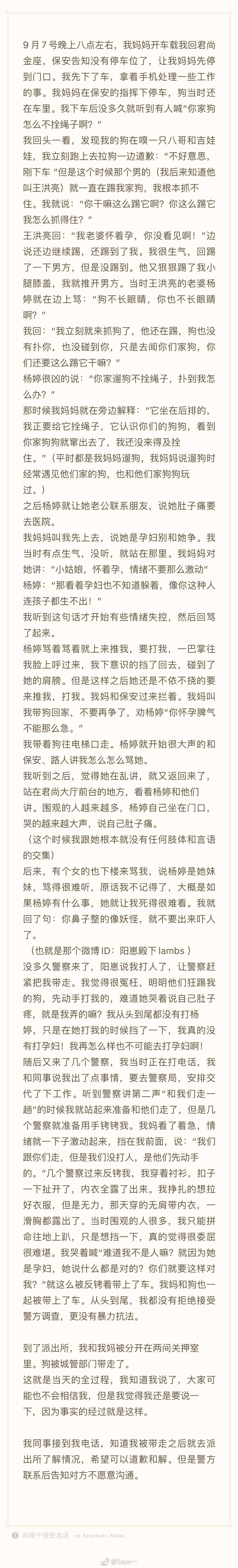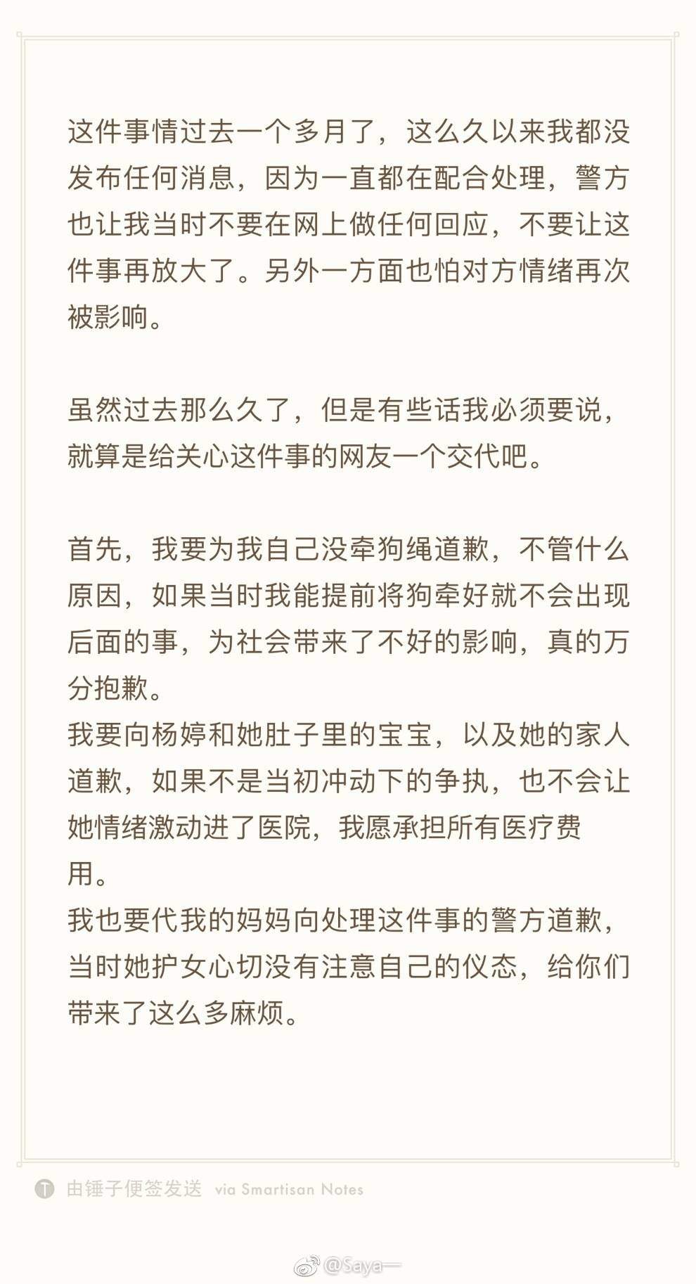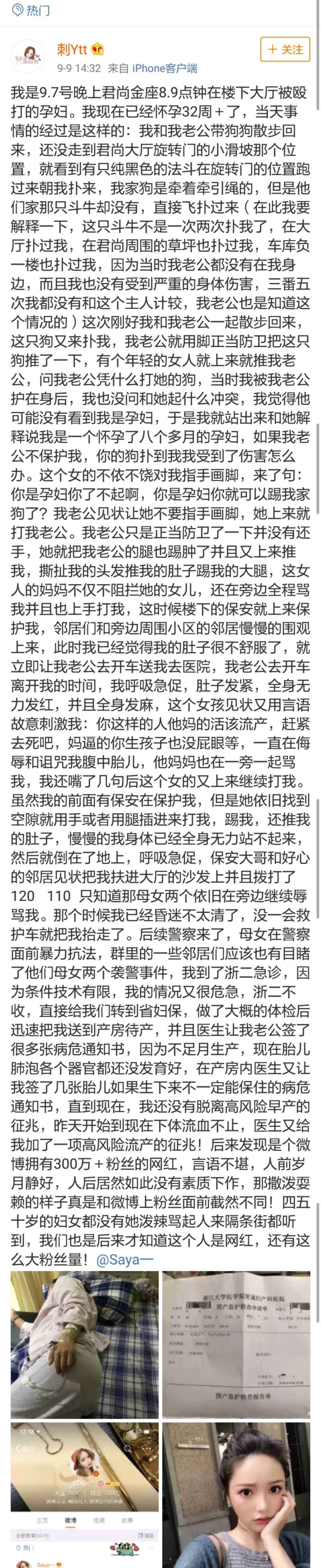 而視頻的最開始,可以聽到路人的交談,這段交談透露:雙方的狗打了起來,孕婦丈夫踢了網紅的狗,雙方吵了起來,Saya被孕婦打了幾下,她沒打孕婦。派出所來了之後,孕婦開始“裝死”,“裝”去醫院了,警察叫Saya回派出所瞭解情況Saya不肯。