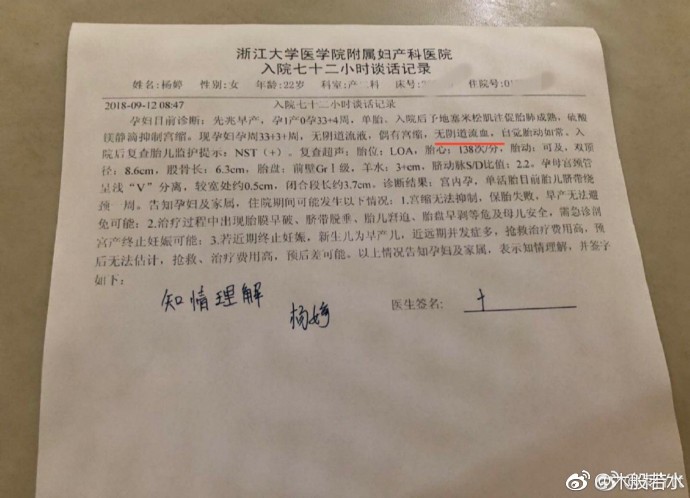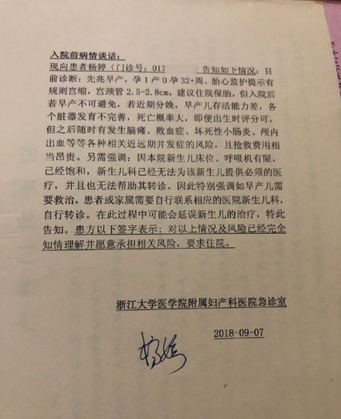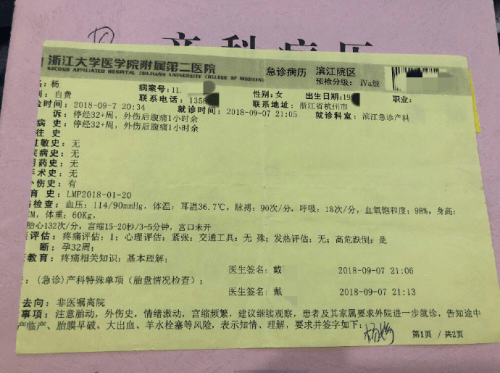 急診病例開具於浙江大學醫學院附屬第二醫院,3張病情談話開具於浙江大學醫學院附屬婦產科醫院,可以符合孕婦微博講述的就診經歷。