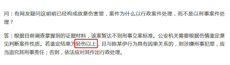 @平安濱江 在解答網友的疑問時提到,輕傷以上,應追究刑事責任,否則,依法應對其作出行政處理。