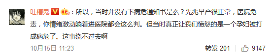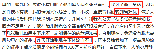 孕婦在微博中提到,自己情況嚴重,簽署了數張病危通知書,直至發微博的9月9日,依舊下體流血不止。