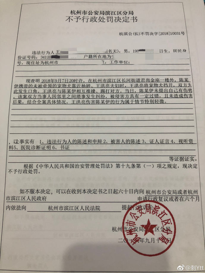 杭州市公安局濱江區分局對孕婦丈夫開具了不予行政處罰決定書,裏面提到孕婦丈夫確實傷害了網紅,但屬於情節特別輕微。