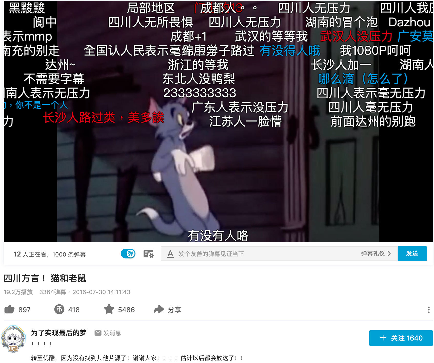 這正是許多年前全國各地出現的方言配音版《貓和老鼠》,只能在很小一塊地域流行的原因。