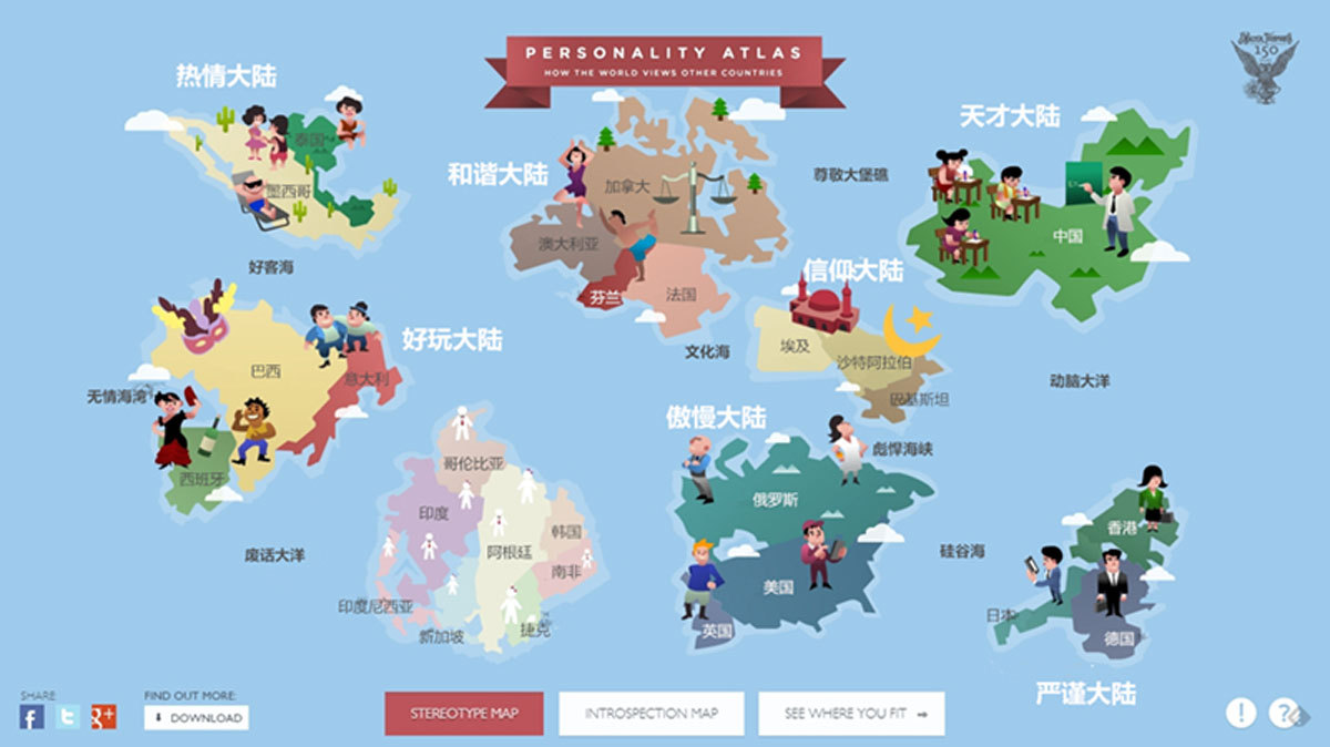 2015年,智威湯遜廣告公司(JWT)基於對來自27個國家和地區的6075名受訪者的調查,整理成了一份“全球性格地圖”(Personality Atlas),將不同國家和地區重新整合出了有趣的新大陸。