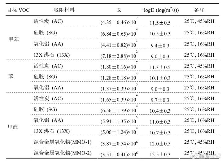 某些空氣淨化器為了增加宣傳賣點,常使用非碳類過濾器作為甲醛過濾介質(如凝膠類,沸石類,氧化鋁,硅藻土,納米礦晶等等),這些過濾介質通過負載除甲醛配方往往可以獲得較強的甲醛去除能力,但是對於其他有害氣體的過濾能力非常有限,比如,常見的氣相吸附材料對於甲苯與甲醛的吸附效果如下[5](K值代越大,飽和平衡時,吸附材料表面被吸附物質濃度越高):