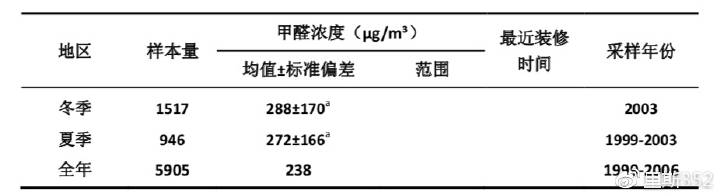 結論3:哪怕內牆漆、板材(傢俱+地板)均符合國家標準,同時保證極佳的通風(1次/h),最終室內的甲醛濃度仍會高達0.2258mg/m³,是美國標準0.019mg/m³的11.4倍,是國標B/T18883-2002推算值的9.4倍,在這裏貼出參考文獻[12]的抽樣調查的結果佐證我們估算的準確性: