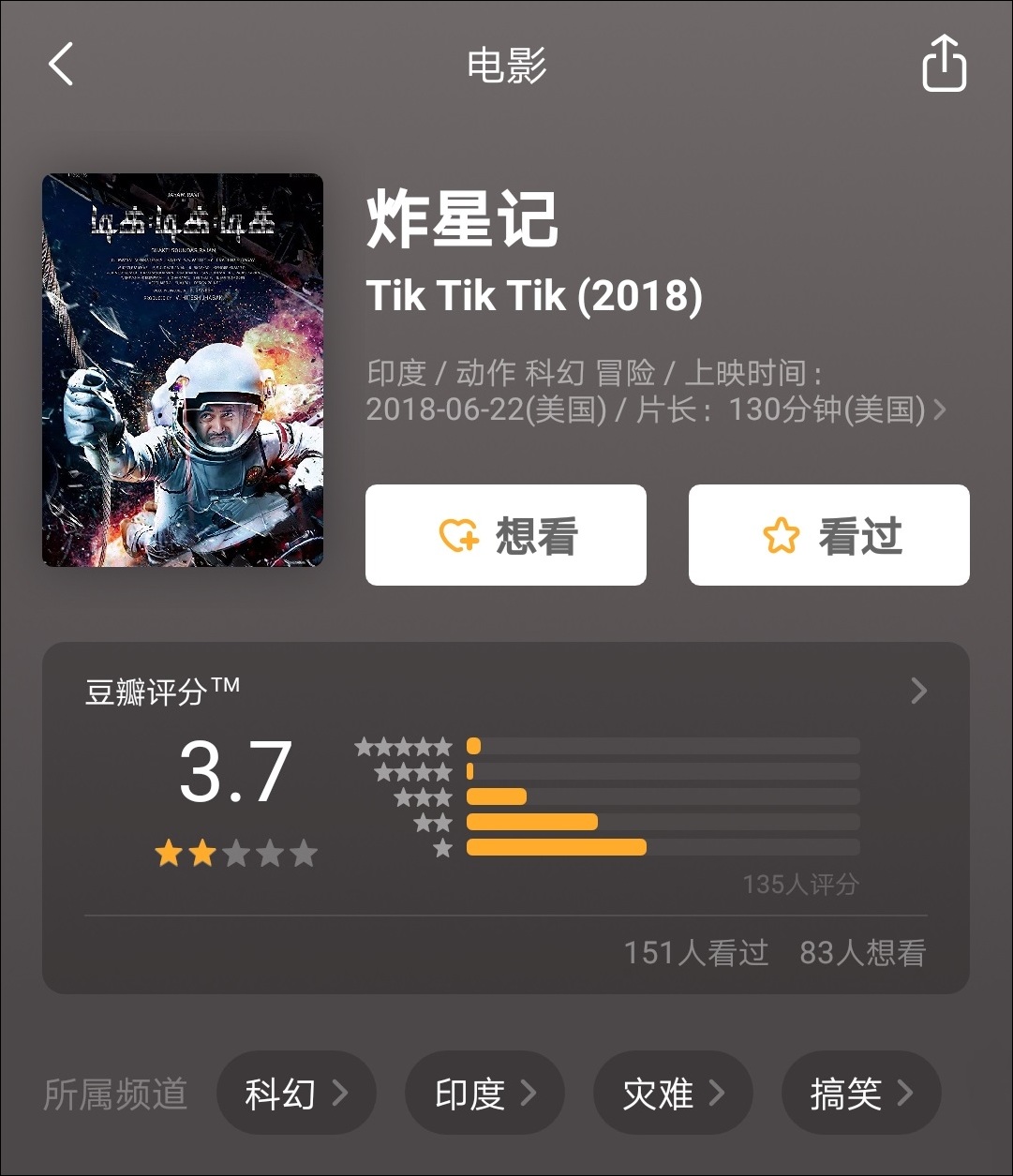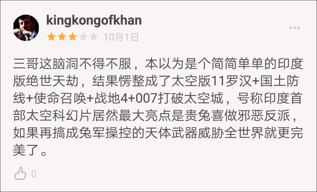 這部影片號稱是印度首部太空科幻片,於今年6月22日(美國)上映,在我國豆瓣平台上評分低至3.7。