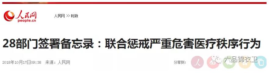 備忘錄上説的清楚,不管你多部門聯合懲戒的措施有多少條,但是聯合懲戒的先決條件是:聯合懲戒對象是因實施或參與涉醫違法犯罪活動,被公安機關處以行政拘留以上處罰,或被司法機關追究刑事責任的嚴重危害正常醫療秩序的自然人。換句通俗的話説,就是因侵犯醫生或醫院的權益,被公安機關行政拘留和被公安機關起訴後法院判刑的人,才符合被懲戒的對象。
