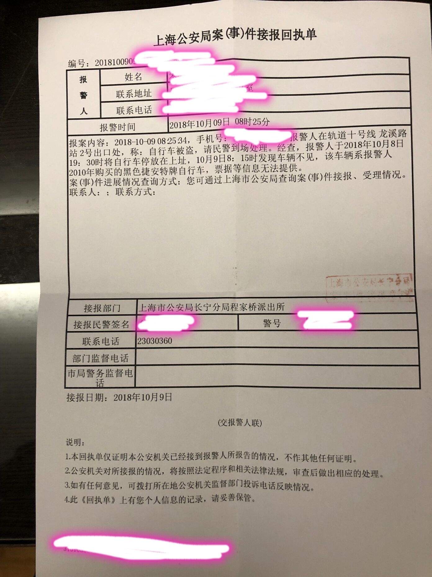 在長達20分鐘的詢問之後,警察蜀黍將打印出來的筆錄給我看,讓我簽字確認,並給了我報案回執單。想想外地朋友和我説他們那自行車被偷後,警察根本不受理,心中感慨上海警方這報案流程還走的很完整啊。隨後警察蜀黍和我説,想了解案情進展的話可以撥打回執單上的電話號碼進行詢問,如果案情有突破也會與我聯繫。看着手中的報案回執單,好歹也是人生第一張報案回執單,很有紀念意義啊。