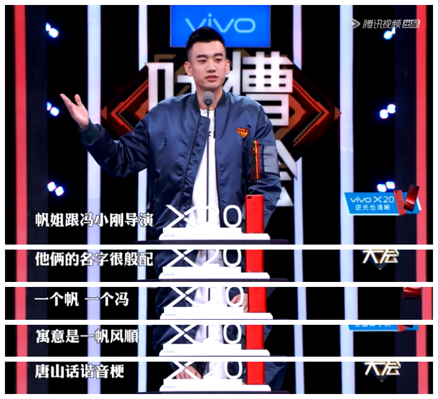 “脱口秀大王”龐博在某節目裏介紹徐帆的時候,説徐帆與馮小剛一家的名字,“帆”和“馮”湊在一起當“一帆風順”講,如果諧音不諧,“一帆風順”就唸成了“一帆馮順”,念出了一股唐山味兒。