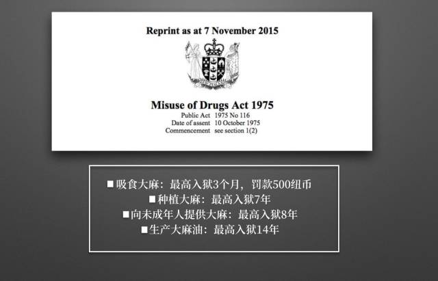 這項規定來自《1975毒品濫用法案》,法案將大麻歸為C級毒品(中等危害)。其中明確規定,在新西蘭持有任何數量的大麻都是違法行為。