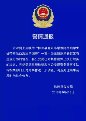 近日,一條“老師罰學生站了幾分鐘,竟然被抓進派出所關了7小時”的消息在網絡上迅速發酵,該消息稱,因學生遲到被老師罰站,身為派出所副所長的學生父親,之後派人將老師帶走。昨日晚間,株洲縣發佈官方信息,稱涉事派出所副所長已被停職檢查,縣紀委監委已介入調查,今日將公佈調查結果。