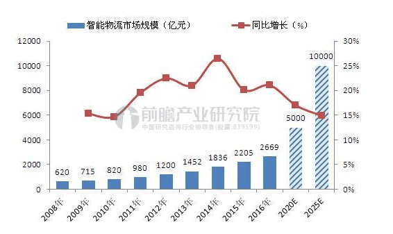 巨頭們在無人物流領域發力,除了是為了更好的服務用户,其實這個市場的發展潛力也是一個不可忽視的重要因素。根據前瞻產業研究院發佈的《2017-2022年中國智能物流行業市場需求預測與投資戰略規劃分析報告》數據顯示,2016年中國智能物流市場規模約為2669億元,同比增長21%,到2025年有望超過萬億元。