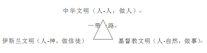 古絲綢之路將中國的“四大發明”通過阿拉伯傳到歐洲,對接農耕文明、遊牧文明和海洋文明;一帶一路將三大世界級文明:中華文明(着眼於人-人關係,強調做人)、伊斯蘭文明(着眼於人-神關係,強調做信徒)及基督教文明(着眼於人-自然關係,強調做事)再次融通起來,以文明之合,超越文明之分:
