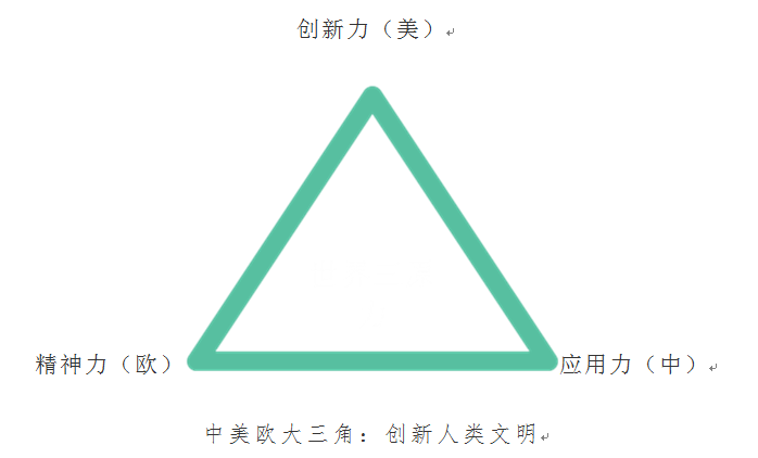 世界上有三大原力:美國所代表的創新力,歐洲所代表的精神力,中國所代表的應用力,只有這三力結合,才能解決人類面臨的根本性問題。“一帶一路”為中美歐大三角文明創新展示了希望。中美、中歐經濟關係越來越有競爭性,但全球治理方面卻越來越具有互補性。“一帶一路”框架下的中美歐合作為規避雙邊競爭性,開啓全球合作,提供希望。一帶一路不僅不是排斥西方,而是中國與西方合作開發第三方市場,彰顯現代文明的三原力。