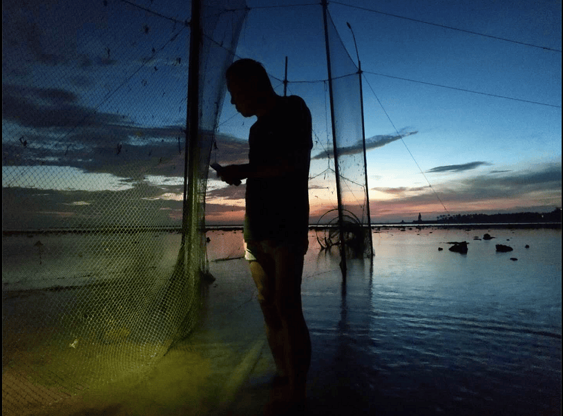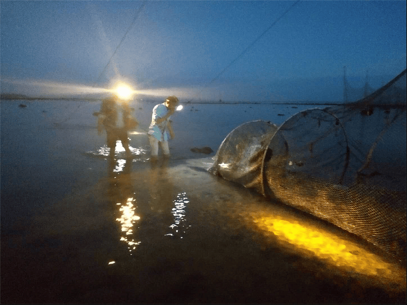 一位外地遊客看到用這張網趕海捕魚很是好奇!