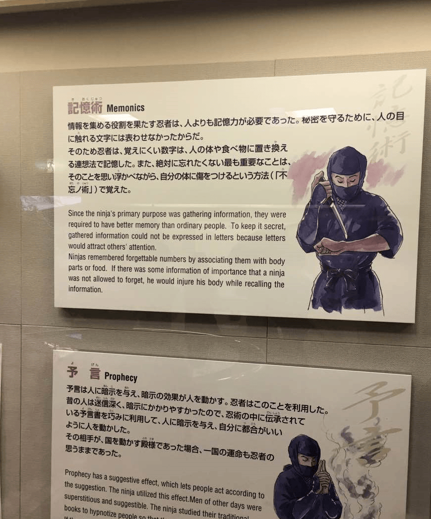 根據忍者博物館的説法:“使用忍術的人是忍者。 忍術不是一門武術。 忍術是一種獨立的戰爭藝術,主要在三重縣伊賀地區和日本滋賀縣的古賀地區發展……大多數人都認為忍者飛過天空後消失,就像超人一樣揮舞忍者劍,偷偷摸摸進入敵人的行列並刺殺將軍……這是電影和漫畫書中引入的忍者的錯誤形象。忍者的工作分為兩類主要的間諜活動和策略。忍術是進行間諜活動和策略的方法。間諜活動類似於現代間諜的工作,仔細收集有關敵人的情報並分析其軍事實力。