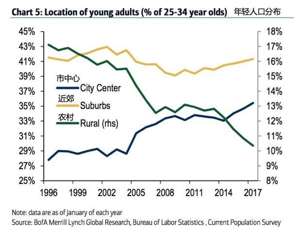 年輕人更喜歡選擇在大城市定居和發展。下圖為1996年-2017年中25-34歲成年人選擇城市、郊區、農村的比例和趨勢: