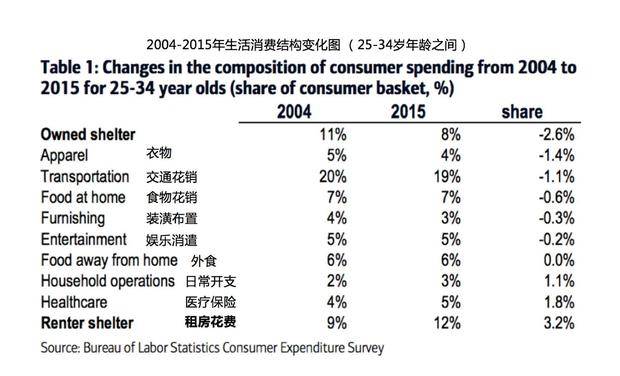 圖中可以看到最後一項Renter Shelter(租房)近十年間從9%增長到了12%。越來越多的年輕人選擇租房,在吃穿用度上增加生活質量。