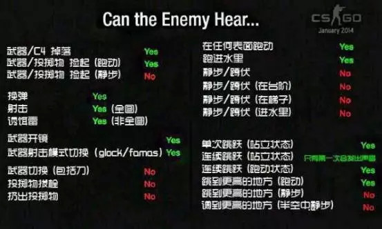 那麼最重要的是敵人能不能聽到呢?切槍敵人是聽不到的,但是拆消音器、換彈夾、丟槍、撿槍都是可以聽見的(如果身上沒有槍,按E吸槍過來是聽不到的)。其次,拔手雷拉環也聽不到,但是丟出去的一瞬間能聽到手雷脱手的嘩啦一聲。其中,燃燒瓶是個特例燃燒瓶在點燃點燃情況下(也就是按住了左鍵,但是還沒有鬆開丟出去時),是能聽到火燃燒的聲音的(僅限T,CT的燃燒彈拉環和手雷一樣是聽不到的,只有扔出去的一瞬間才能被聽到)。另外,AUG、SG553、大狙、鳥狙等帶有瞄準鏡的槍,敵人可以聽到你開鏡的聲音。空中劃刀也是可以聽到的。