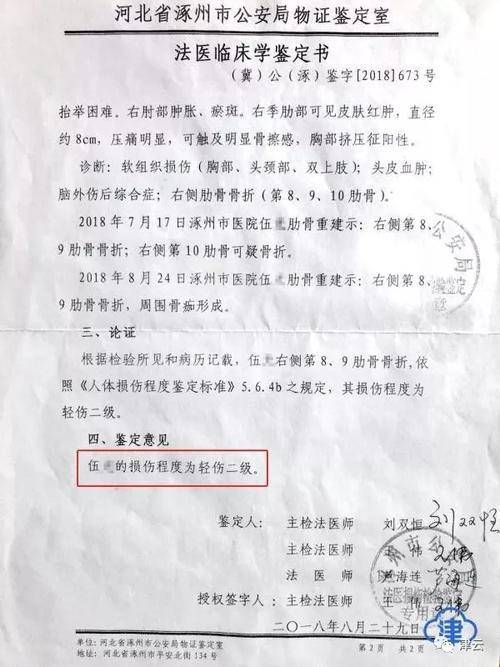 9月6日,仍未等到電話的伍醫生又一次來到派出所詢問鑑定結果,再一次向涿州市公安局投訴後,他於當日下午見到了自己的法醫臨牀學鑑定書,他的損傷程度被鑑定為“輕傷二級”。警方再一次為他做了筆錄,在做筆錄的過程中,他看到毆打他的王某也來到了派出所。