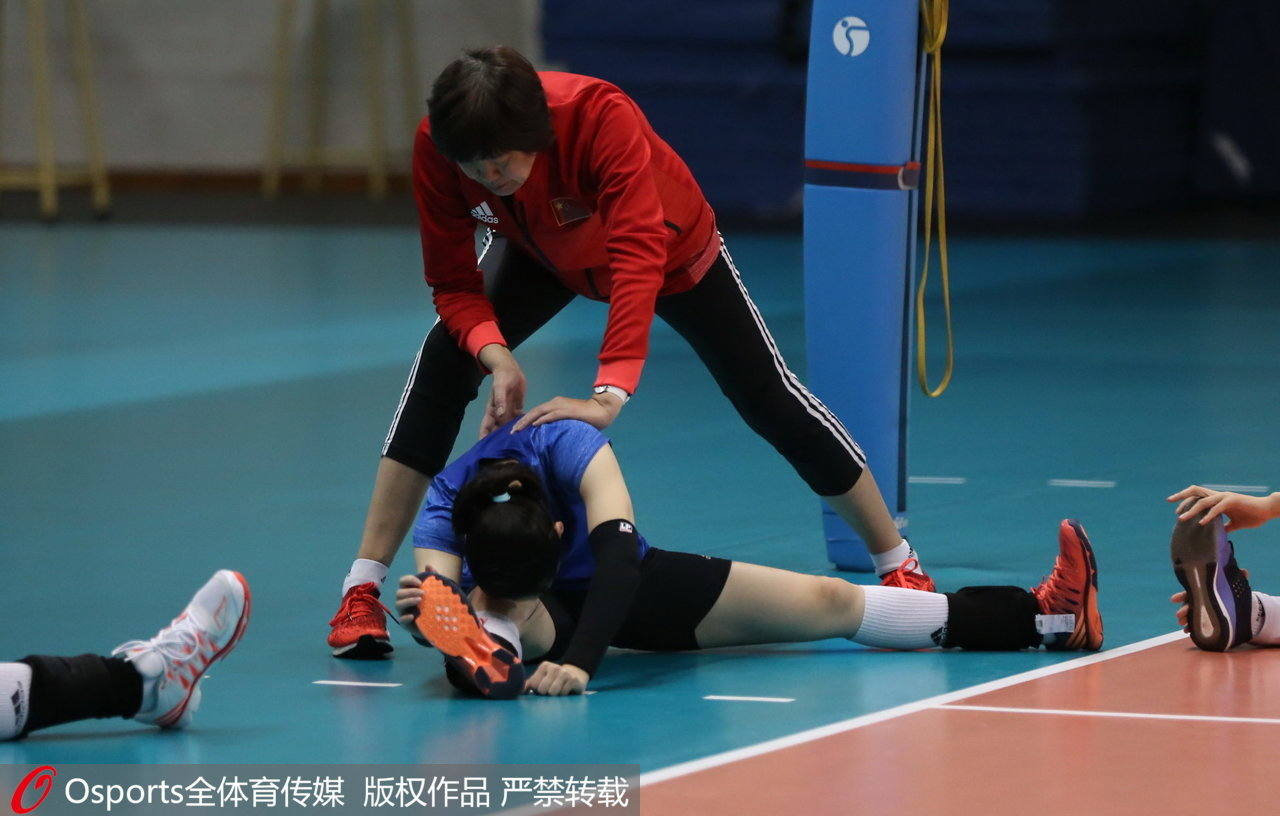 郎平幫隊員壓腿。