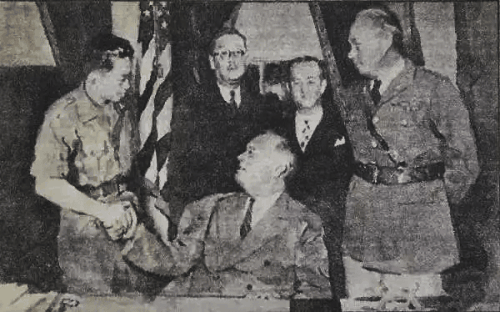 不巧的是,歐洲正在爆發政治和金融危機,一場潛在的世界大戰即將爆發,所以,潘德明又乘船來到了美國紐約,繞了一圈加拿大渥太華,回到了華盛頓見了當時的羅斯福總統,總統説:這是美國人民贈送給你的,你應該享有榮譽,榮譽永遠屬於有奮鬥精神的人。旅行家先生,希望你在今後的旅途中再勇敢些。