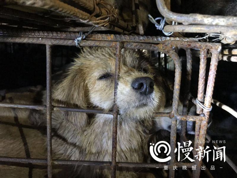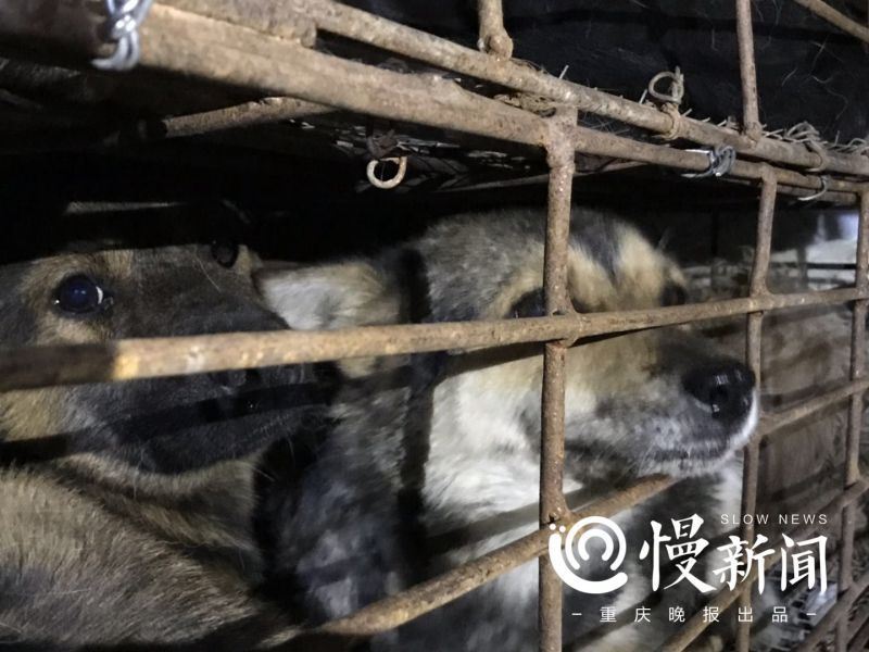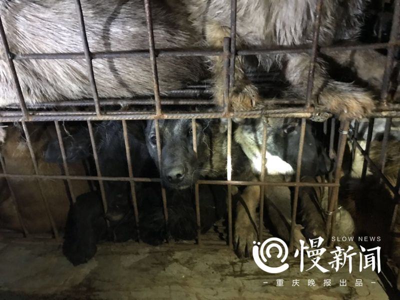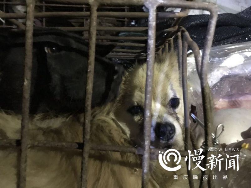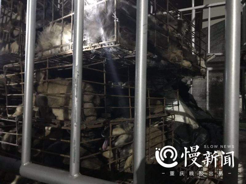 17日晚11時許,上游新聞·重慶晚報慢新聞記者趕到走馬派出所,現場陸續有志願者聞訊趕來,聚集在派出所周邊。派出所院子裏停着一輛白色的小型貨車。透過貨箱側欄,能看到裏面堆放着數個鐵籠,每個鐵籠裏都密集地塞滿了狗。籠子裏有一兩隻狗已經斷了氣。志願者推測,這是由於惡劣的運輸環境造成的;另有部分犬隻呈流口水、鼻尖凝結帶血絲的棕青色鼻涕等病態。有志願者向記者指認其中有川東獵犬、阿拉斯加和貴賓等犬種。