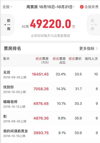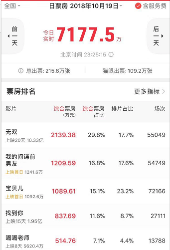進入10月的第3個週五,又有一波新片入市,但是佔據票房冠軍寶座的,還是國慶檔的《無雙》。新片票房疲軟,而國慶檔的老片也早已消耗完了能量,導致週五票房只有7000萬。
