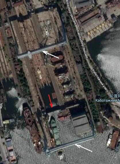 拉近了看,可以看到黑海造船廠著名的0號船台以及與之配套的2台大型龍門吊: