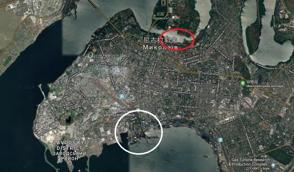 黑海造船廠與61名公社社員造船廠都位於尼古拉耶夫市,但兩座船廠一南一北、分處城市兩端。下圖中紅圈處是61名公社社員造船廠,白圈處是黑海造船廠: