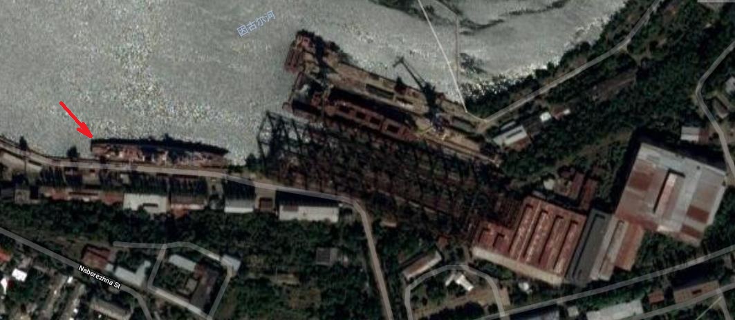 紅色箭頭所指即為停在碼頭邊上的“紅色烏克蘭”號,其東面的“網格”是船台的頂棚,在參考消息微博所發的第7張圖右側也能看到頂棚: