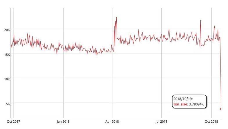 首先,XMR交易的平均大小已經下降到3.7kb,比硬分叉前的18.5kb降低了80%。由於門羅隱私系統的獨特特性導致了區塊鏈的快速增長,因此減少交易產生的數據大小這一舉措對於許多門羅用户來説應該是一個可喜的變化。