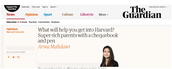 《衞報》在最後説,保守派們喜歡譴責一些反歧視的行動是“逆向的種族主義”,譴責種族配額的觀念。然而,這場官司,也許是無意中弄清楚了一件事,在精英機構中廣泛實施的扶持行動計劃並沒有幫助少數族裔,他們幫助的是富人,而且主要是白人。
