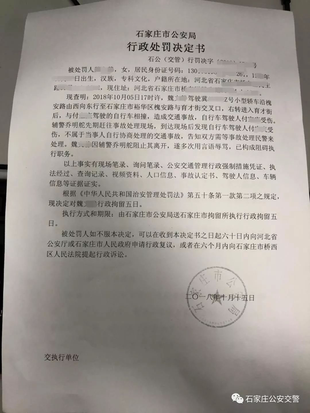 10月15日,對魏某阻礙執法行為,石家莊市公安局依法對其做出行政拘留5日的處罰。
