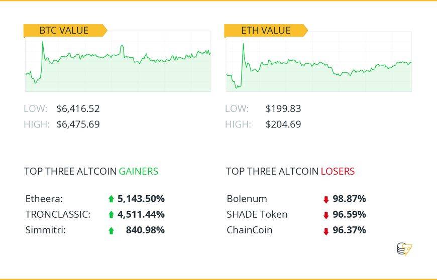 本週前三名加密貨幣獲利者是Etheera,TRONCLASSIC和Simmitri。 本週排名前三的山寨幣輸家是Bolenum,SHADE Token和ChainCoin。
