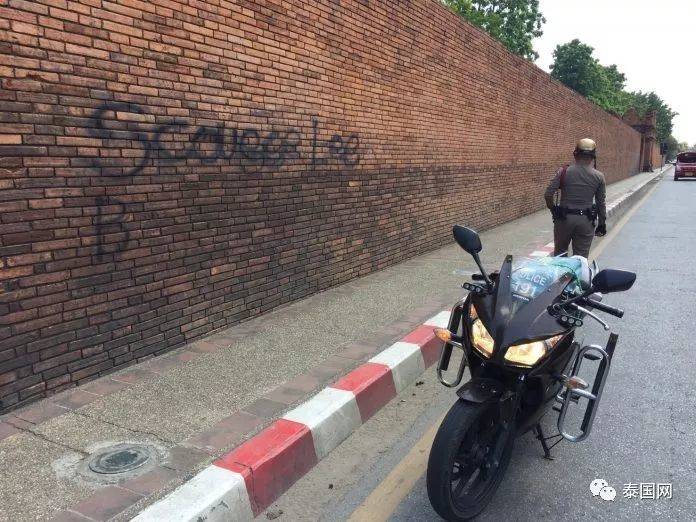 據監控視頻記錄,當地時間10月18日凌晨4點,23歲的Lee Furlong用一罐黑色噴漆在清邁東邊的古城牆塔佩門(Tha Pae Gate)上進行塗鴉,塗鴉還塗錯了,先是寫的“Scousse Lee”,然後又把它改成了“Scouser Lee”。