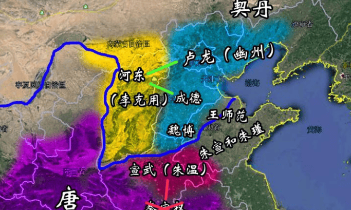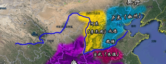 我們看完這個圖就會發現,其實朱温的地盤並不怎麼樣,他本來地方就不大,還是以河南為主的中原四戰之地,屬於誰來都能踩一腳的地方,反而這個河東節度使李克用佔有山西以及河套的一大部分,身在西北易守難攻。而橫在朱温、李克用之間的,正是那個唐朝內部的獨立王國——河北三鎮節度使。