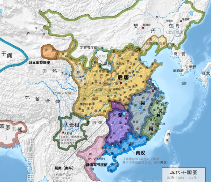 總之吧,這個所謂的“十國”,並非是先後存在的王朝,而是楊吳(南唐)、吳越、閩、北漢、前蜀(後蜀)、荊南、馬楚、南漢十個南方割據勢力的合稱,除了我上面講的,其他基本都是在唐朝滅亡後,當地軍閥的割據,沒什麼影響大局的故事,這裏就不贅述了。